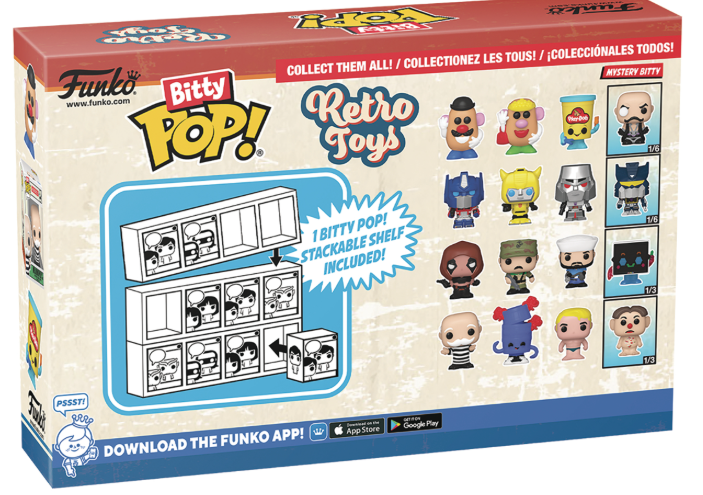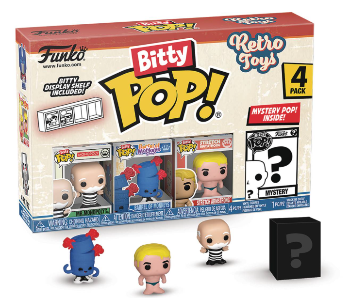 Your favorite Retro Toy Pops! have been shrunk into Bitty Pops! This 4-pack includes Bitty Pop! Mr. Monopoly, Bitty Pop! Barrel of Monkeys, Bitty Pop! Stretch Armstrong and a mystery Bitty Pop! figure. The possible mystery Bitty Pops! are Hyper Rare (1/6) Soundwave, Hyper Rare (1/6) Dr. Mindbender (chase), Rare (1/3) Cavity Sam, and Rare (1/3) Lite-Brite. Bitty Pops! are packaged in hard acrylic cases with detachable bottom lids. Detachable bottom lids double as acrylic bases, to which the Bitty Pop! figures are adhered. Vinyl figures are approximately 0.9-inches tall. Four figures per single package purchase.
